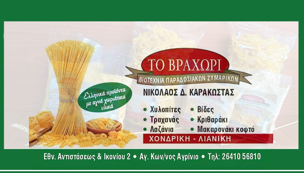 Το εργαστήριο παραδοσιακών ζυμαρικών "ΤΟ ΒΡΑΧΩΡΙ" χρησιμοποιεί τα πιο αγνά υλικά της περιοχής μας για να παράγει φρέσκα ζυμαρικά χωρίς συντηρητικά. Στόχος του είναι να προσφέρει στον καταναλωτή προϊόντα υψηλής ποιότητας και την γεύση των παλιών χειροποίητων ζυμαρικών.