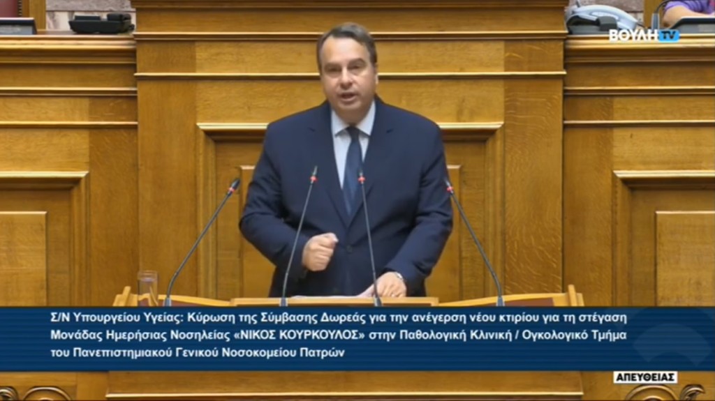 Στην Ολομέλεια της Βουλής μίλησε ο Βουλευτής Αιτωλοακαρνανίας της Νέας Δημοκρατίας, Θανάσης Παπαθανάσης, κατά τη συζήτηση για την κύρωση της σύμβασης δωρεάς της κυρίας Λάτση για την ανέγερση της νέας Μονάδας Ημερήσιας Νοσηλείας «Νίκος Κούρκουλος» στο Πανεπιστημιακό Νοσοκομείο Πατρών.