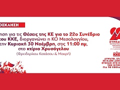 ΠΡΟΣΚΛΗΣΗ Συζήτηση για τις Θέσεις της ΚΕ για το 22ο Συνέδριοτου ΚΚΕ , διοργανώνει η ΚΟ Μεσολογγίου,την Κυριακή 30 Νοέμβρη , στις 11:00 πμ,στο κτίριο Χρυσόγελου(Φρειδερίκου Κατάσου & Μακρή)